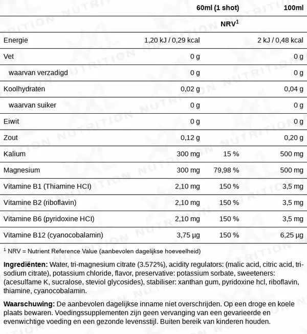 Tot slot bevat Magnesium Shot een variatie aan B-vitamines die je lichaam rondom de training verder ondersteunen. Zo ondersteunt Thiamine (Vit. B1) het hart, helpt Riboflavine (Vit. B2) bij de bescherming van gezonde lichaamscellen en draagt Vitamine B12 bij aan het proces van celvernieuwing.